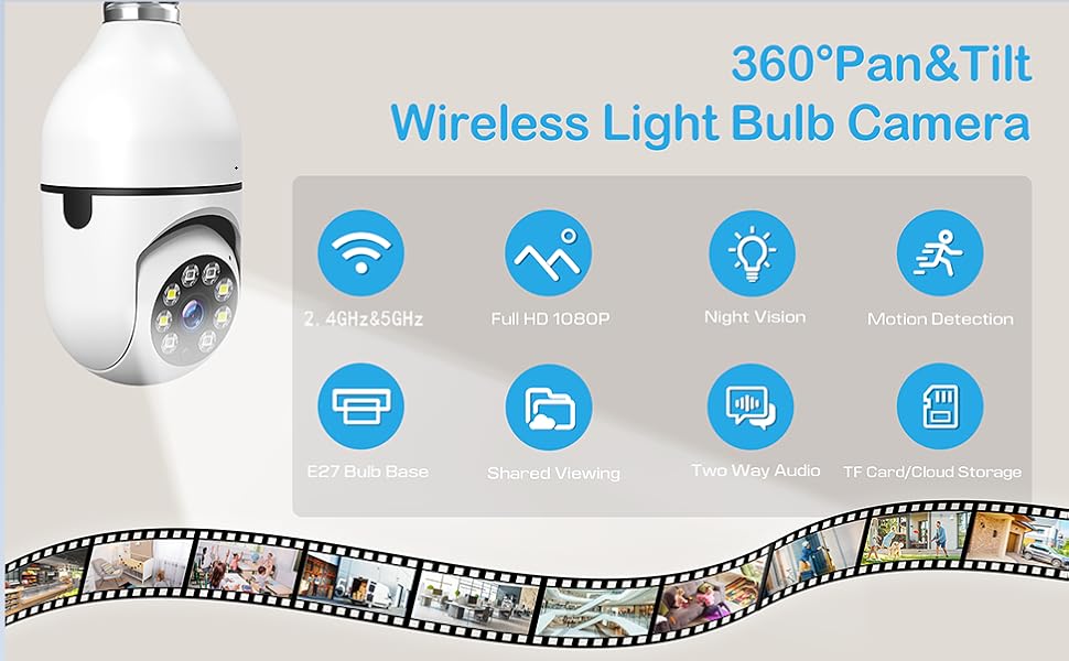 "Keep your home safe with this 720P Smart Bulb Security Camera, offering crystal-clear video, motion detection, and easy 2.4G WiFi setup. Disguised as a light bulb, it provides 360° coverage with night vision and mobile app control for peace of mind anytime, anywhere.”